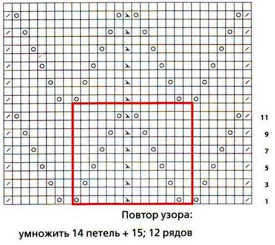 Прибавление петель в ряду - 1 лиц., накид, * 6 раз (из 6 петель получаем 12 ) чередуются с убавлением петель - две лиц. вместе, провязанных с наклоном влево * 3 раза, две лиц. вместе, провязанных с наклоном вправо * 3 раза (из 12 петель получаем 6). Именно этот ряд создает волнообразный рисунок. В схемах этого узора часто встречается неточность: в месте убавления петель обычно указывается один значок - две петли провязанные вместе, тогда как на самом деле наклон этих петель различен: три петли с наклоном влево, другие три петли с наклоном вправо. При вязании данного узора, как и во всех ажурных узорах, необходимо следить, чтобы количество накидов в ряду совпадало с количеством двух петель, провязанных вместе. Начинать вязание узора всегда следует с трех петель прибавления или убавления, а не с шести. В противном случае полотно будет вязаться по диагонали, как если бы в каждом ряду в начале мы 1 петлю прибавляли, а в конце ряда убавляли.